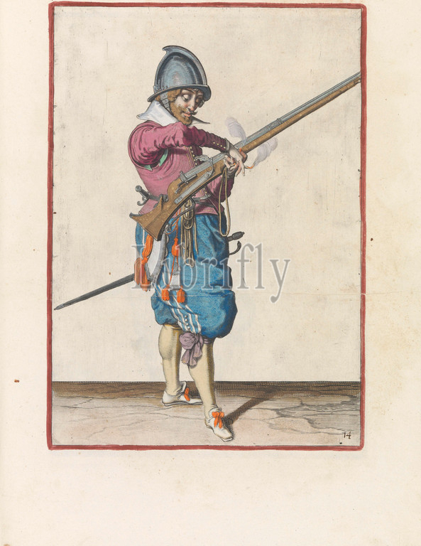 Soldier with a rudder transferring his wick from his right to his left hand Corte onderwysinghe on the figuerliicke imagehe, important right ghebruyck des Roers (original series title), A soldier, full-length, to the right, holding a rudder (a certain type of firearm) with his left hand. The burning fuse in his right hand is transferred to his left hand. This print is part of the series of 42 hand-numbered prints of gunmen in the arms handling, handling of weapons, military training, firearms: rifle, Jacob de Gheyn (II) (workshop of), The Hague, c. 1597 - 1607, paper, engraving, h 360 mm × w 260 mm