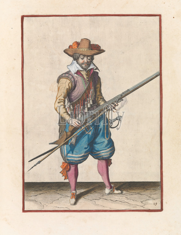 Soldier shaking gunpowder, musket Corte underhand, figuerliicke image, soo, aengaet, right ghebruyck vant Musquet, original series title, soldier, full-length, right, shake hands, musket, a certain type, firearm, remove any powder, fallen outside, pan, powder container, left hand, addition, course, furket, musket fork, burning wick, print, part, series, 43 hand-numbered prints, musketeers, Wapenhandelhe, handling, weapons, military training, firearms, rifle, Jacob de Gheyn, II, workshop, Hague, c, 1597, 1607, paper, engraving