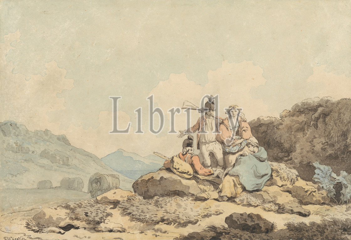 Soldiers and Country Women, Francis Wheatley, 1747–1801, British, undated, Pen and black ink with watercolor on medium, smooth, cream wove paper, Sheet: 5 x 7 3/8 inches (12.7 x 18.7 cm), apron, babies, bonnet, breeches (trousers), coat, dress, foliage, genre subject, gun (small arm), hat, hills, men, military art, plume, rocks (landforms), shirt, shoes, soldiers, stockings, trees, wagon, wigs, women, Ireland