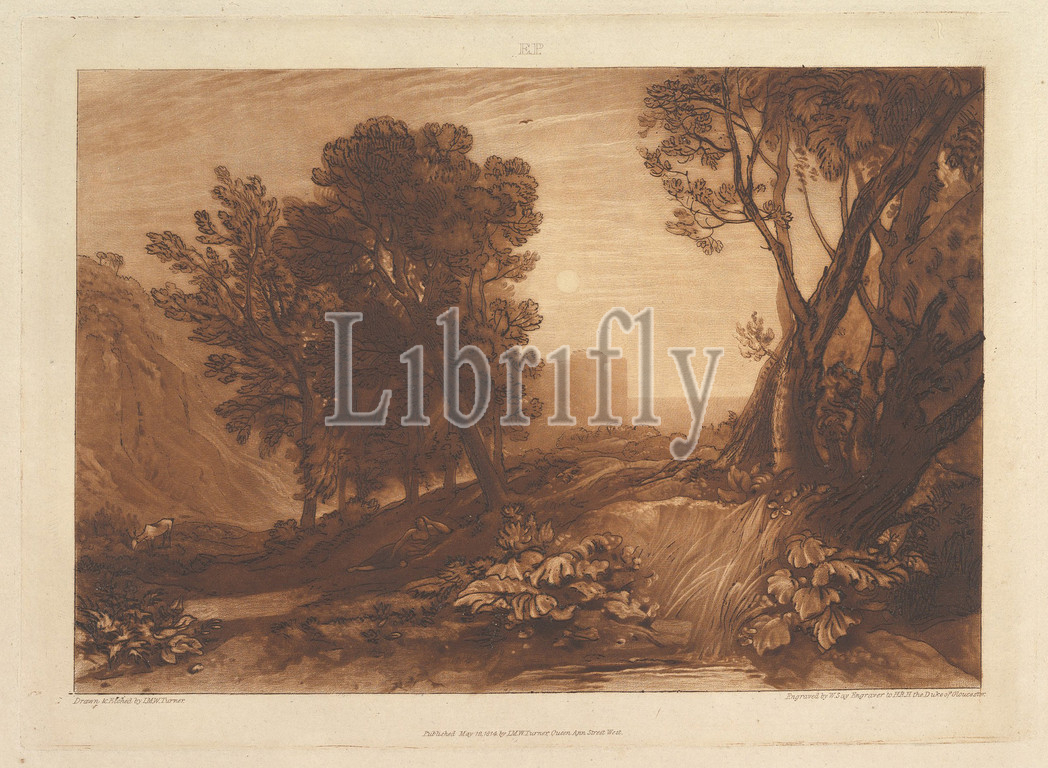 Solitude, Reading Magdalen, Liber Studiorum, part XI, plate 53, 12, 1814, Etching, mezzotint, first state, seven, Finberg, plate, 7 x 10 1/4, 17.8 26 cm, Prints, Designed and etched by Joseph Mallord William Turner, British, London, 1775–1851, Turner distilled, ideas, landscape, Latin, Book, Studies, series, seventy prints, plus, frontispiece published, 1807, 1819, establish, compositions, brown watercolor, drawings, etched outlines, copper plates