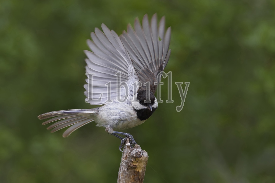 Sombre Tit taking off from branch, Poecile lugubris