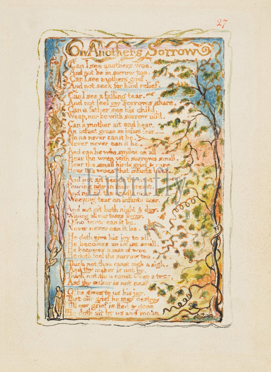 Songs, Innocence, Experience, Anothers Sorrow, ca, 1825, Relief etching printed, orange-brown ink, hand-colored, watercolor, gold, sheet, 6 3/16 x 5 9/16, 15.7 14.1 cm, Prints, William Blake, British, London, 1757–1827