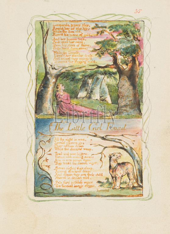 Songs, Innocence, Experience, Little Girl Lost/ Little Girl, ca, 1825, Relief etching printed, orange-brown ink, hand-colored, watercolor, gold, sheet, 6 3/16 x 5 9/16, 15.7 14.1 cm, Prints, William Blake, British, London, 1757–1827