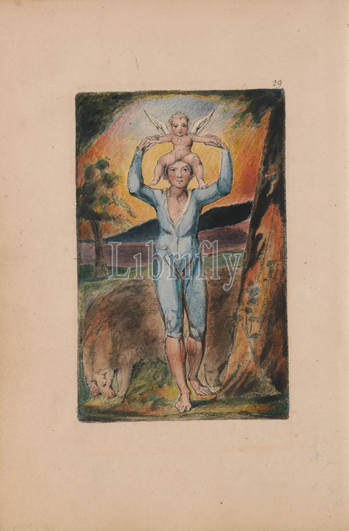 Songs, Innocence, Experience, Plate 29, Experience Frontispiece, Bentley 28, Print, William Blake, 1757–1827, British, 1789, 1794, Relief etching printed, dark-brown, pen, black ink, watercolor, moderately thick, slightly textured, cream wove paper, Sheet, Plate, Spine, 7 3, 8 inches, 18.7 cm, angel, baby, branches, children, hills, infant, leaf, literary theme, man, religious, mythological subject, tree, wings