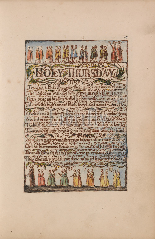 Songs, Innocence, Experience, Plate 10, Holy Thursday, Bentley 19, Print, William Blake, 1757–1827, British, 1789, 1794, Relief etching printed, dark-brown, pen, black ink, watercolor, moderately thick, slightly textured, cream wove paper, Sheet, Plate, Spine, 7 3, 8 inches, 18.7 cm, branches, children, leaf, literary theme, pairs, procession, text, trees, vine, walking