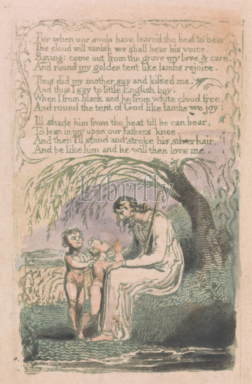 Songs, Innocence, Experience, Plate 6, Little Black Boy, Bentley 10, Print, William Blake, 1757–1827, British, 1789, Relief etching printed, green, pen, black ink, watercolor, moderately thick, slightly textured, cream wove paper, Sheet, Plate, Plate, branches, children, historical subject, leaf, men, river, shepherd, text, trees, water