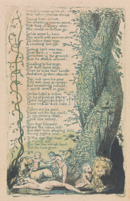 Songs of Innocence and of Experience, Plate 22, 'The Little Girl Found' (Bentley 36), Print made by William Blake, 1757–1827, British, 1789, Relief etching printed in green with pen and ink and watercolor on moderately thick, slightly textured, cream wove paper, Sheet: 7 1/4 x 4 3/4 inches (18.4 x 12.1 cm), Plate: 4 3/8 x 2 3/4 inches (11.1 x 7 cm), and Plate: 4 1/4 x 2 5/8 inches (10.8 x 6.7 cm), beard, branches, children, harp, historical subject, infant, kneeling, leaf, leaf, lion, men, nudes, sleeping, standing, text, tiger, trees, vines, women