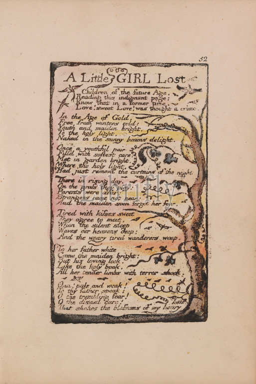 Songs, Innocence, Experience, Plate 52, Little Girl Lost, Bentley 51, Print, William Blake, 1757–1827, British, 1789, 1794, Relief etching printed, dark-brown, pen, black ink, watercolor, moderately thick, slightly textured, cream wove paper, Sheet, Plate, Spine, 7 3, 8 inches, 18.7 cm, birds, branches, leaf, literary theme, text, vines