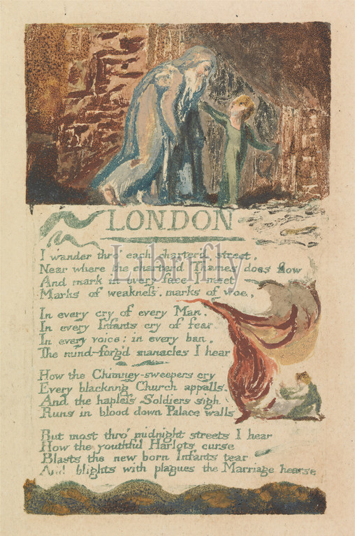Songs of Innocence and of Experience, Plate 39, 'London' (Bentley 46), Print made by William Blake, 1757–1827, British, 1794, Color-printed relief etching with watercolor on moderately thick, slightly textured, cream wove paper, Sheet: 7 1/4 x 4 3/4 inches (18.4 x 12.1 cm) and Plate: 4 3/8 x 2 3/4 inches (11.1 x 7 cm), cane, children, fire, historical subject, house, men, stone, text, vines