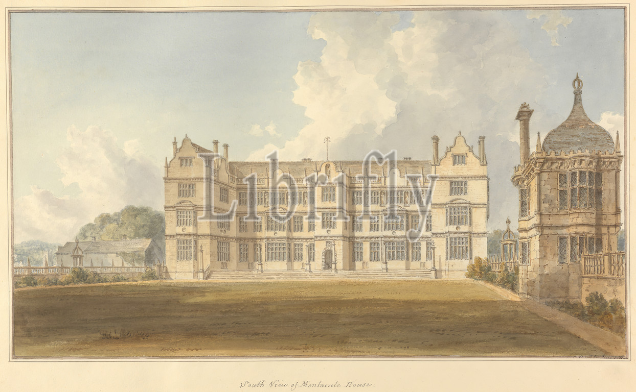 South View of Montacute House, John Buckler FSA, 1770–1851, British, and John Chessell Buckler, 1793–1894, British, 1811, Watercolor and pen and black ink on moderately thick, cream wove paper, Sheet: 19 3/4 × 14 inches (50.2 × 35.6 cm) and Image: 9 3/4 × 17 1/4 inches (24.8 × 43.8 cm), architectural subject, chimneys, country house, Dutch gables, lawn, mullions, parapets, strapwork, windows, England, Europe, Somerset, United Kingdom