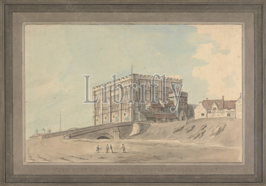 South West View of Norwich Castle October 20, 1775, Capt. Francis Grose, 1731–1791, British, 1775, Watercolor and pen and ink on medium, slightly textured, cream laid paper, Sheet: 7 5/8 x 12in. (19.4 x 30.5cm), Sheet: 7 3/4 × 12 inches (19.7 × 30.5 cm), and Mount: 13 1/2 × 18 7/8 inches (34.3 × 47.9 cm), architectural subject, bridge (built work), castle, figures, village, England, Norfolk, Norwich, United Kingdom