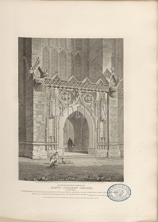 Southern Entrance Porch to King's College Chapel, Cambridge, Chapel of King's College in Cambridge, signed: Engraved by S. Rawle, from a Drawing made by JL Bond, Fig. 14, Pl. IV, to p. 8, Bond, John Linnell (pinx.); Rawle, S. (sc.), 1805, John Britton: The architectural antiquities of Great Britain: represented and illustrated in a series of views, elevations, plans, sections and details of various ancient English edifices: with historical and descriptive accounts of each. Bd. 1. London: J. Taylor, 1807-1826