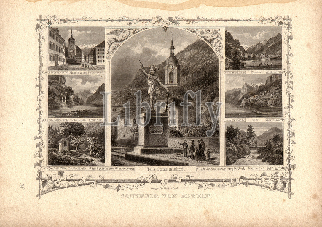 Souvenir from Altdorf, Statue of William Tell in Altdorf and illustrations to other places in the canton of Uri, signed: C. Rorich (sc.), Taf. 13, according to p. 84, Rorich, Carl Franz (sc.), 1865, Ed. Osenbrüggen, C. Huber: Die Urschweiz: classischer Boden der Tellssage verherrlicht durch Schillers Freiheitssang. 3. verb. Aufl. Basel: Druck und Verlag von Crh. Krüsi. [18--]