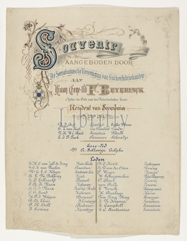 Souvenir offered, Soerabaijasche Association, Sugar Manufacturers, Honorary Member F, Beyerinck Knight, Order, Netherlands Lion Resident, Surabaya 1876-1884, title, object, Calligraphic title page Cut, thin strip, bottom left, Inscription, decorative letters, leaf, flower decorations, Left, middle hangs, branch, order, Dutch Lion, motto, Virtus Nobili tat, Under, heading follow, names, board, association, honorary member, places, residence, Part, photo album, Soerabayasche Association, Sugar Manufacturers offered, Frederik Beyerinck, resident, Surabaya, Java, 1884, paper, ink, paint, coating, drawing