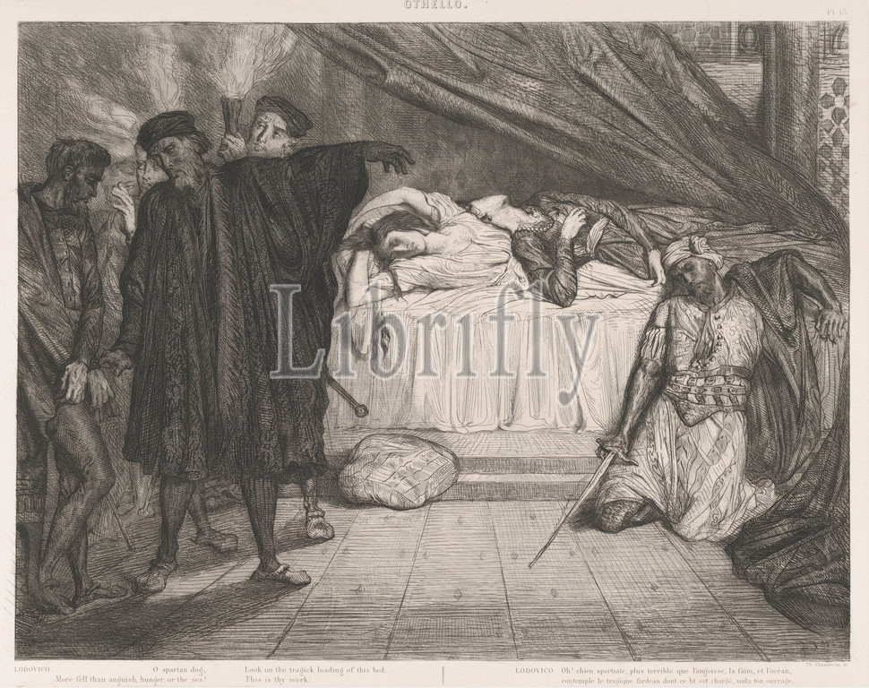 O Spartan dog, plate 15, Othello, Act 5, Scene 2, 1844, Etching, engraving, roulette, drypoint, aquatint, sulphur tint, chine collé, sheet, 25 x 19 1/4, 63.5 48.9 cm, Prints, Théodore Chassériau, French, Le Limon, Saint-Domingue, West Indies, 1819–1856, Paris, Eugène, Piot, commissioned, young, prepare fifteen, illustrations, Shakespeare, Inspired, series, ground-breaking Hamlet, lithographs, Delacroix, created, year earlier, younger artist, opted, linear technique, etching