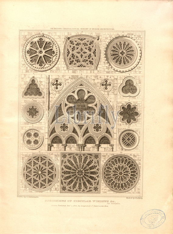 Specimens of circular windows, Examples of Round Windows, Signed: Drawn by G. Cattermole; Etch'd by J. Le Keux; Published by Longman & Co, title page, Cattermold, George (drawing); Keux, John Le (etching); Longman & Co. (published), 1822, John Britton: The architectural antiquities of Great Britain: represented and illustrated in a series of views, elevations, plans, sections and details of various ancient English edifices: with historical and descriptive accounts of each. Bd. 5. London: J. Taylor, 1807-1826