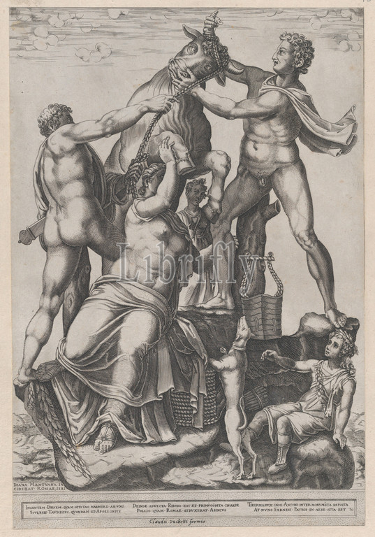 Speculum Romanae Magnificentiae: Amphion and Zethus Tying Dirce to a Wild Bull [The Farnese Bull], 1581, Engraving, sheet: 18 1/8 x 13 9/16 in. (46 x 34.4 cm), Prints, Diana Scultori (Italian, Mantua ca. 1535?–after 1588 Rome)