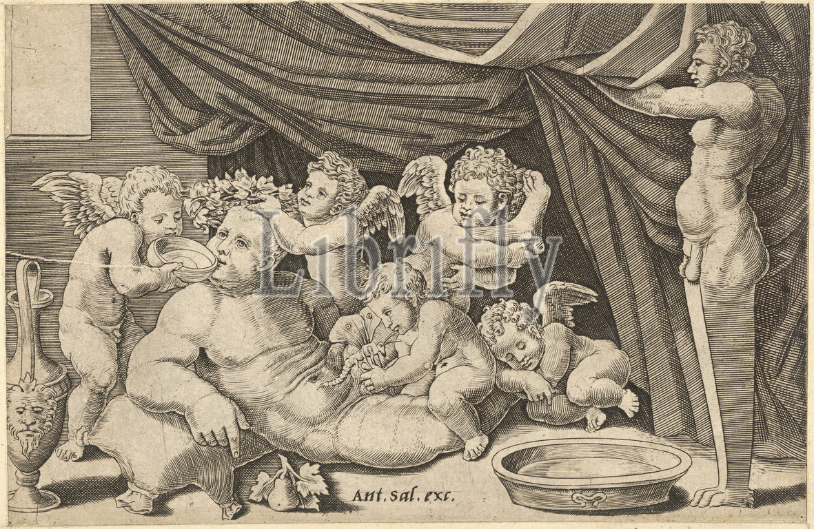 Speculum Romanae Magnificentiae, Bacchus Surrounded, Putti, Priapus holding back, curtain, 16th century, Engraving, sheet, 4 3/4 x 7 3/16, 12 18.3 cm, Prints, Master of the Die, Italian, active Rome, ca., 1530–60, After Raphael, Raffaello Sanzio or Santi, Urbino, 1483–1520, Rome