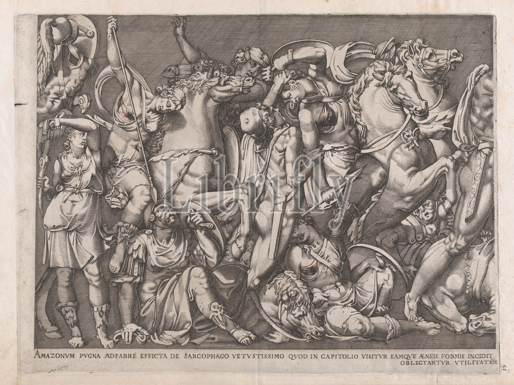 Speculum Romanae Magnificentiae, Battle, Amazons, 1559, Engraving, second state, four, Robert-Dumesnil, sheet, 13 9/16 x 19 1/2, 34.5 49.5 cm, Prints, Nicolas Beatrizet, French, Lunéville, 1515–ca., 1566, Rome