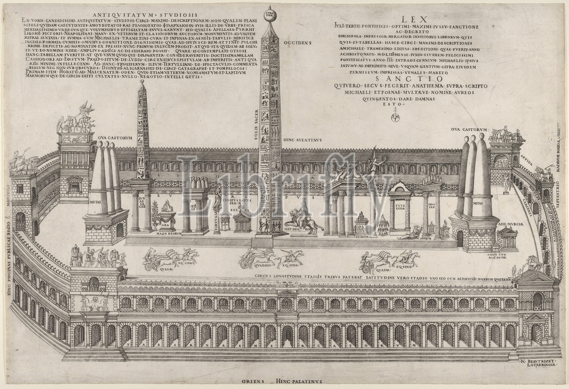 Speculum Romanae Magnificentiae: Circus Maximus, 1553, Engraving; first state of three, sheet: 14 15/16 x 21 7/8 in. (38 x 55.5 cm), Prints, Nicolas Beatrizet (French, Lunéville 1515–ca. 1566 Rome (?)), After Pirro Ligorio (Italian, Naples ca. 1512/13–1583 Ferrara)