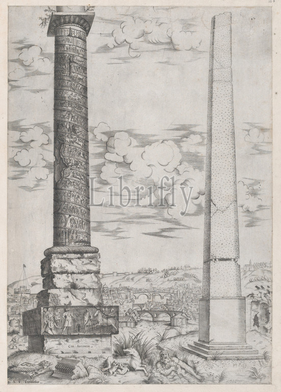 Speculum Romanae Magnificentiae: Column of Antoninus and a Roman Obelisk, ca. 1543–70, Engraving, mount: 17 15/16 x 12 5/8 in. (45.5 x 32 cm), Prints, Attributed to Enea Vico (Italian, Parma 1523–1567 Ferrara)