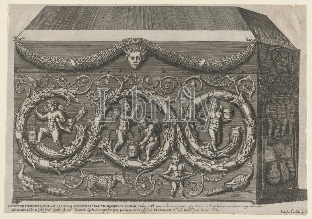 Speculum Romanae Magnificentiae, Decorated Sarcohpagus, Arabesques, 1582, Engraving, etching, sheet, 7 1/16 x 15 15/16, 17.9 40.5 cm, Prints, Giovanni Ambrogio Brambilla, Italian, active Rome, 1575–99