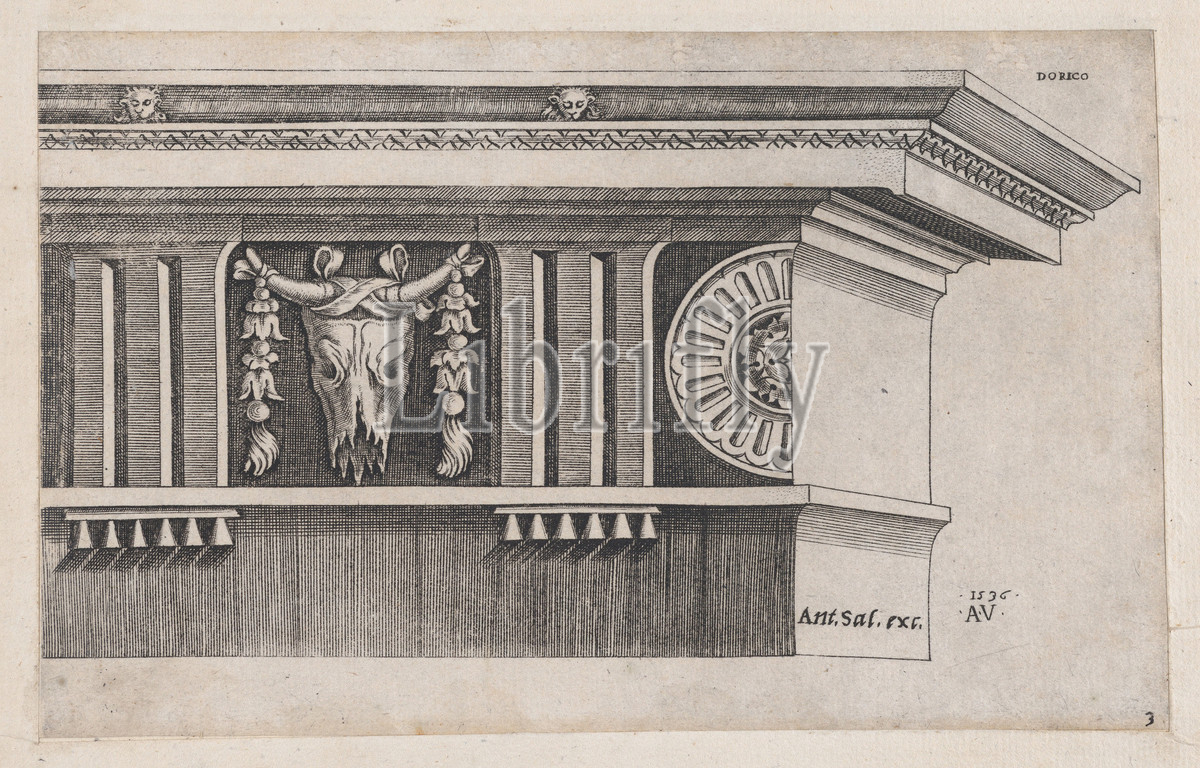 Speculum Romanae Magnificentiae: Doric Entablature, 1536, Engraving, mount: 7 1/16 x 8 7/16 in. (18 x 21.5 cm), Prints, Agostino Veneziano (Agostino dei Musi) (Italian, Venice ca. 1490–after 1536 Rome), After Marcantonio Raimondi (Italian, Argini (?) ca. 1480–before 1534 Bologna (?))