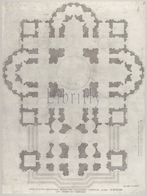Speculum Romanae Magnificentiae: Plan of St. Peter's, 1549, Engraving, sheet: 22 5/8 x 16 13/16 in. (57.5 x 42.7 cm), Prints, After Antonio da Sangallo, the Younger (Italian, Florence 1484–1546 Terni), After Antonio da Labacco (Italian, near Vigevano ca. 1495–after 1567)