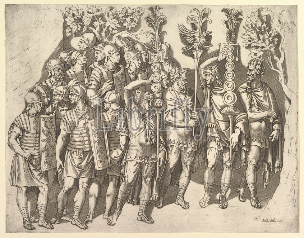 Speculum Romanae Magnificentiae: A Roman Legion (from Trajan's Column), 16th century, Engraving, sheet: 11 9/16 x 14 3/4 in. (29.4 x 37.5 cm) trimmed to platemark, Prints, Marco Dente (Italian, Ravenna, active by 1515–died 1527 Rome)