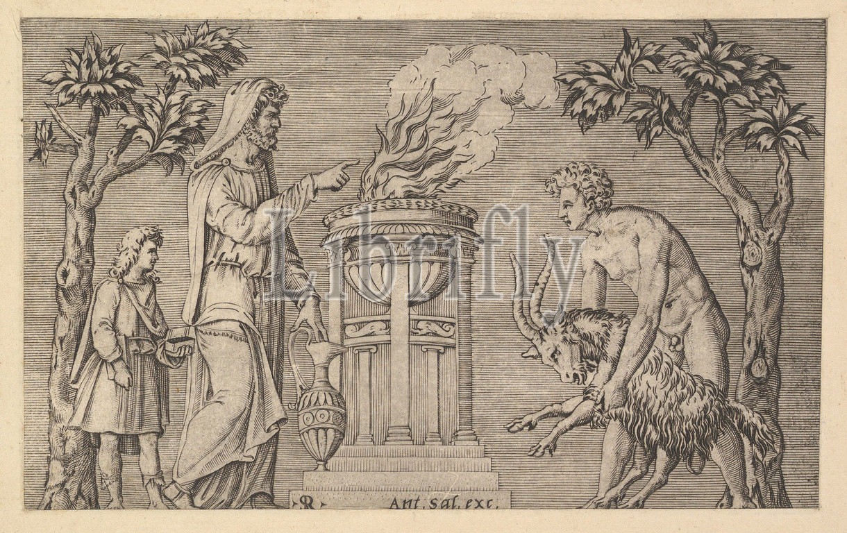 Speculum Romanae Magnificentiae, Sacrifice, Ram, 16th century, Engraving, sheet, 4 3/16 x 6 7/8, 10.6 17.4 cm, Prints, Marco Dente, Italian, Ravenna, active by, 1515–died, 1527, Rome