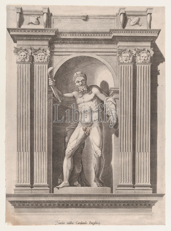Speculum Romanae Magnificentiae, Sculpture, faun standing, niche, statue, Scipione Borghese, villa, 16th century, Etching, sheet, 16 3/8 x 11 13/16, 41.6 30 cm, Prints, Anonymous