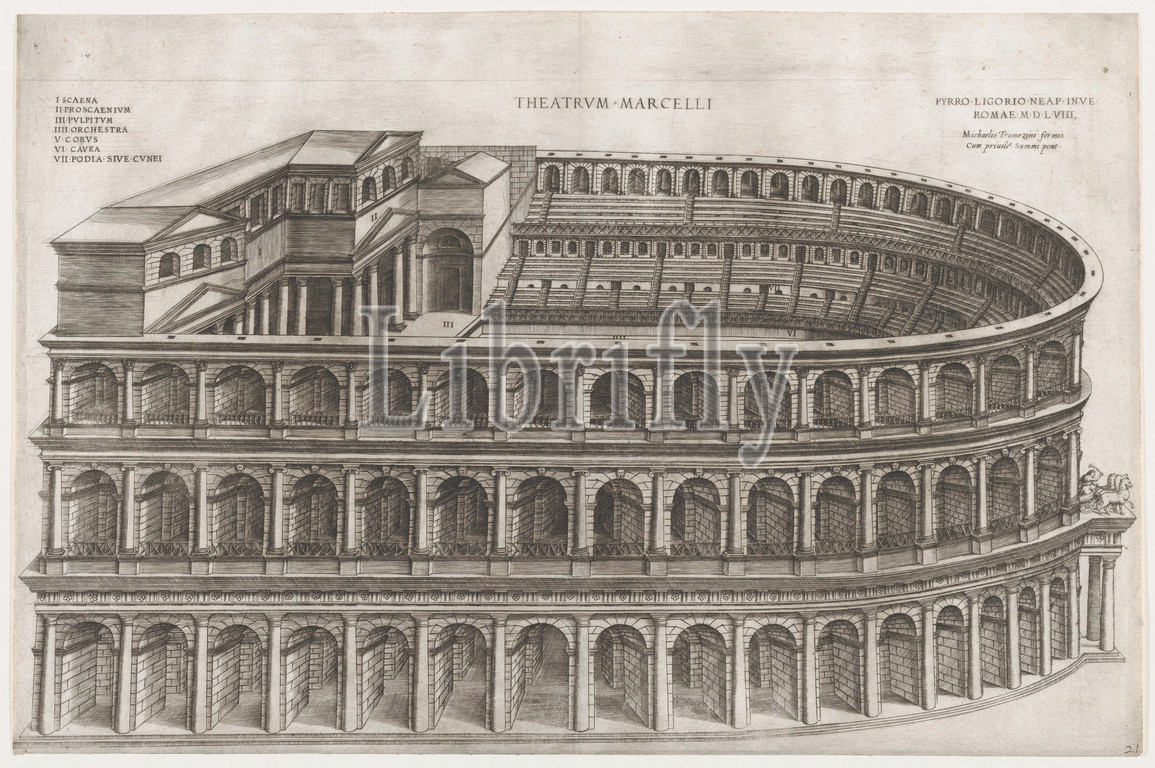 Speculum Romanae Magnificentiae, Theater, Marcellus, 16th century, Engraving, sheet, 14 5/16 x 21 11/16, 36.4 55.1 cm, Prints, Pirro Ligorio, Italian, Naples ca., 1512/13–1583, Ferrara