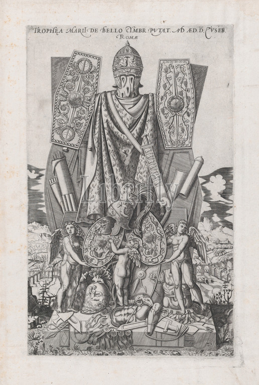 Speculum Romanae Magnificentiae, Trophies, Marius, 16th century, Engraving, etching, sheet, 19 1/8 x 13 3/8, 48.5 34 cm, Prints, Anonymous