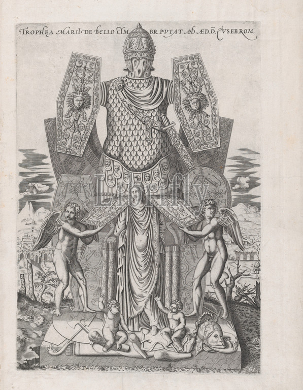 Speculum Romanae Magnificentiae, Trophies, Marius, 16th century, Engraving, etching, sheet, 19 1/8 x 13 3/8, 48.5 34 cm, Prints, Anonymous