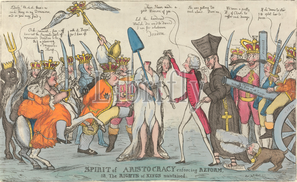 Spirit of Aristocracy enforcing Reform, Or, The Rights of Kings maintained, (?) William Dent, active 1784–1793, 1792, Etching with watercolor on laid paper, Sheet: 10 1/8 x 16 1/2in. (25.7 x 41.9cm)