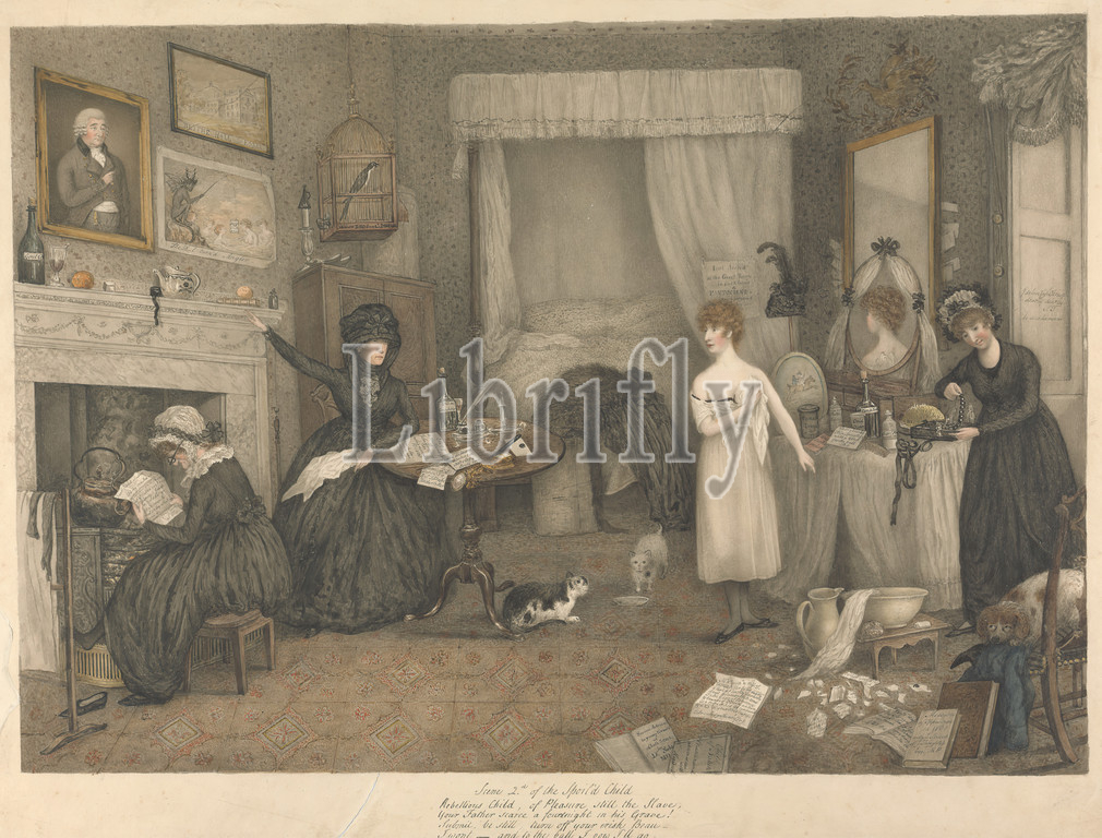 Spoiled Child, Scene II, Lewis Vaslet, 1742–1808, British, ca, 1802, Watercolor, black ink, gray wash, graphite, moderately thick, slightly textured, cream wove paper, Sheet, Image, ball, party, bed, furniture, bedroom, birdcage, bonnets, books, bottles, canopy, cats, chairs, death, devil, dog, animal, fireplace, fishing, genre subject, gesture, girl, gowns, grief, humor, ink bottle, interior, jewelry, jug, laundry, letters, mirrors, mourners, mourning, papers, pointing, potions, quill, reading, satire, stools, tables, tea kettle, undressing, vanity, wardrobe, washbowl, widow, women