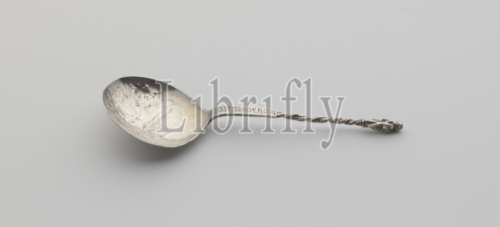 Spoon made of silver, Silver spoon with a partly turned stem. On top of the stem the statue of St Andries. Engravings: IOHA: ROERJA and ANNA: SI: VIF. Groningen (?), Perhaps at the end of the 16th century. On the flat part of the stem is engraved., anonymous, Groningen (possibly), c. 1575 - c. 1600, silver (metal), l 15.7 cm × w 23.3 gr