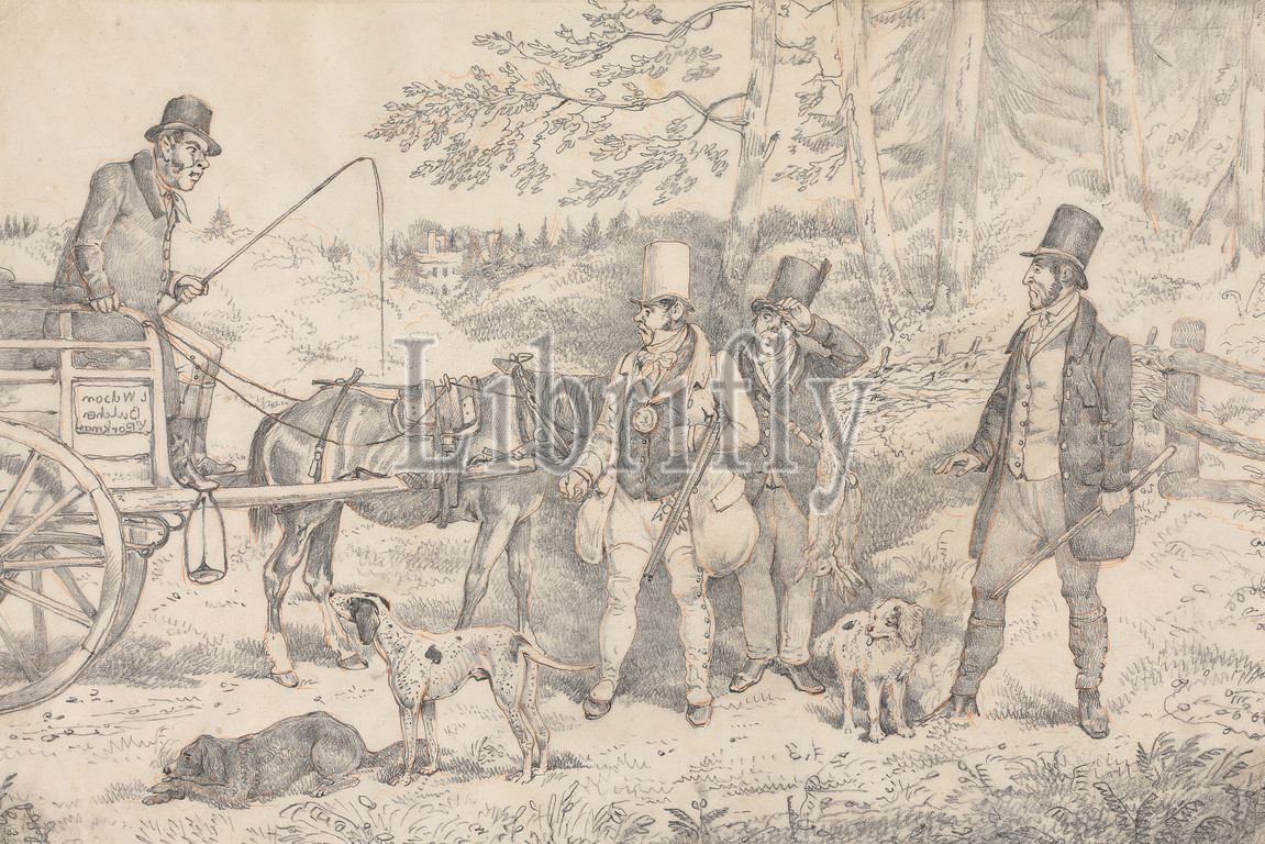 'Sporting Anecodotes:' Drawing for the Soft-Gound Etching of 'The Sporting Butcher', Henry Thomas Alken, 1785–1851, British, undated, Graphite and red chalk on medium, smooth, blued white, wove paper, Sheet: 8 5/16 × 12 7/16 inches (21.1 × 31.6 cm), building, butchers, dogs (animals), driver, driving, fence, hares, horse (animal), hounds (dogs), men, sporting art, trees, wagon, whip