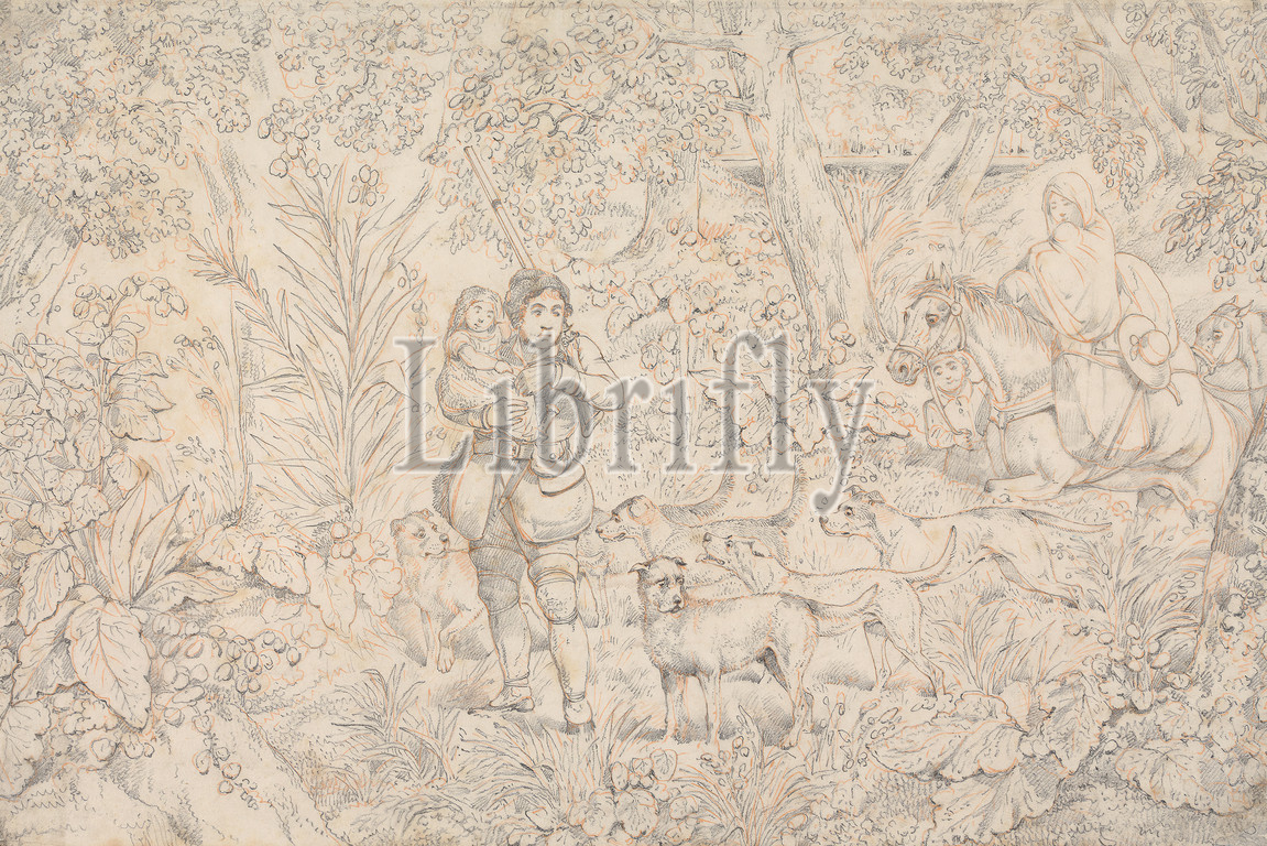 Sporting Incidents, Drawing, Soft-ground Etching, Wood, Henry Thomas Alken, 1785–1851, British, Graphite, red chalk, medium, slightly textured, blued white, wove paper, Sheet, animals, children, people, age group, dogs, animals, family, forest, horseback riders, horseback riding, horses, animals, man, plants, shotgun, sporting art, trees, woman, woods