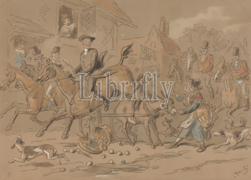 Sporting Parson, Sends Mother Eve's Apples Flying, Hablot Knight Browne, 1815–1882, British, Black chalk, watercolor, gouache, moderately thick, slightly textured, brown, wove paper, Sheet, apples, basket, buildings, caricature, dogs, animals, donkey, horseback riders, horseback riding, horses, animals, hunt, hunters, hunting, jumping, men, parson, people, sporting art, town, trees, women