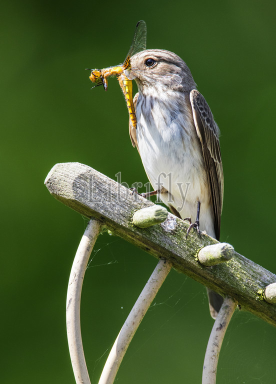 Spotted flycatcher, sitting on hay rake, Netherlands