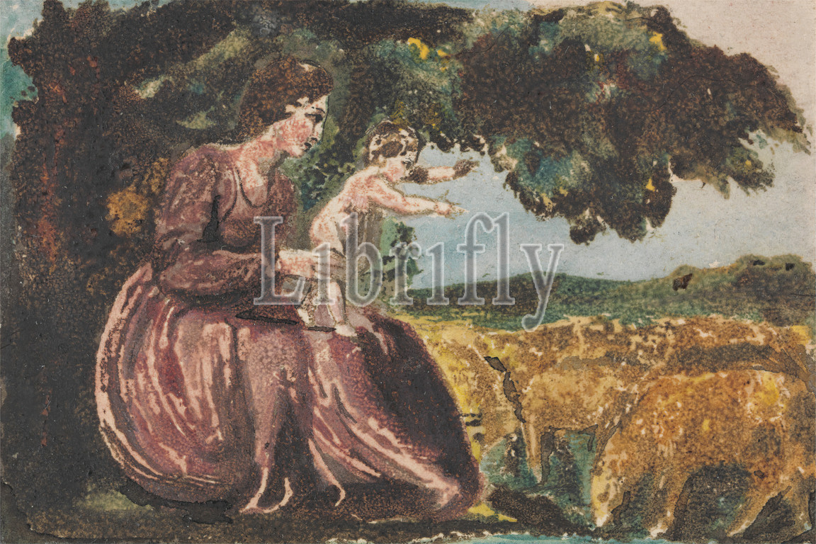 Spring, Songs, Innocence, Print, William Blake, 1757–1827, British, ca, 1795, Color-printed relief etching, pen, black ink, watercolor, moderately thick, slightly textured, cream wove paper, Sheet, children, genre subject, grazing, hills, infants, mothers, sheep, sitting, spring, trees, vines, women