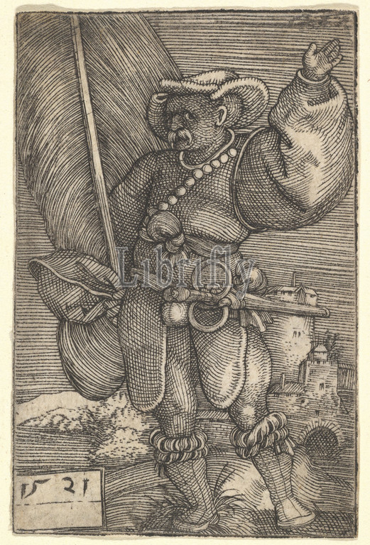 Standard Bearer, Raised Left Hand, early 16th century, Engraving, Sheet, 2 1/4, 1 1/2, 5.7, 3.8 cm, Prints, Barthel Beham, German, Nuremberg ca., 1502–1540, Italy