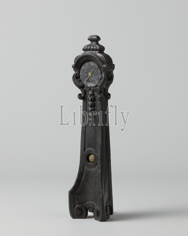 Standing clock, miniature, carved, solid piece, black-stained wood, dial, black-and-white, engraved, flowers, hands, gold, Amsterdam, c, 1700, 1720, wood, plant material, linden, metal, engraving