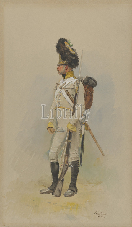 Standing Grenadier, Municipal Guard, 1891, Watercolor, traces, graphite, heightened, white, gray wove paper, glued, cardboard, sheet, 20 1/2 x 11 5/8, 52 29.6 cm, Drawings, Édouard Detaille, French, Paris, 1848–1912