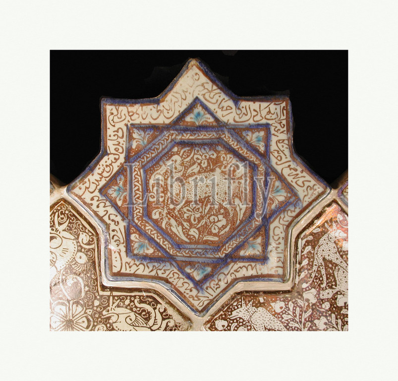 Star-Shaped Tile, 14th century, Iran, Stonepaste, inglaze painted, blue, turquoise, luster-painted, opaque white glaze, 8 x 8, 20.3 20.3 cm, Ceramics-Tiles, eight-pointed, star, tile, part, panel, cross-shaped tiles, adorning, walls, Ilkhanid building, center, spotted gazelle, stands, field, vegetation, reference, motif, jairan, deer gazing, moon, originated, Chinese Buddhist, art