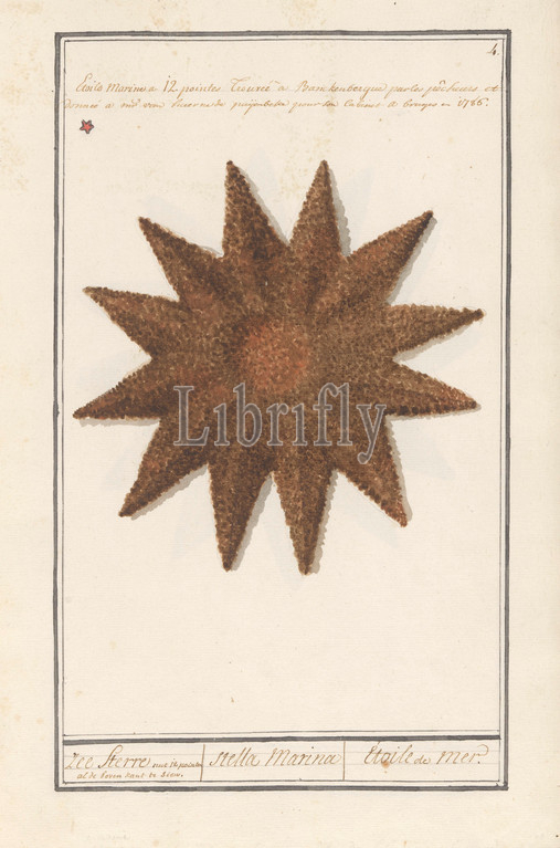 Starfish, Asteroidea, Sea Sterre, stella Marina, Etoile de Mer, title, object, Numbered top right, 4, Top left marked, red star, top, note, discovery, starfish, beach, Blankenberge, 1786, Part, sixth album, drawings, fish, shells, insects, Sixth, twelve albums, animals, birds, plants, 1600, commissioned, Emperor Rudolf II, explanations, Dutch, Latin, French, echinoderms, Southern Netherlands, paper, pencil, chalk, watercolor, paint, deck paint, brush