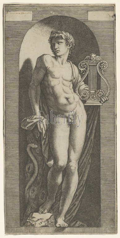statue, Apollo, naked standing, niche, holding, lyre, left hand, leaning, tree trunk, 1512–15, Engraving, 8 11/16 x 4 1/4, 22.1 10.8 cm, Prints, Marcantonio Raimondi, Italian, Argini, ca., 1480–before, 1534, Bologna, Designed by Raphael, Raffaello Sanzio or Santi, Urbino, 1483–1520, Rome
