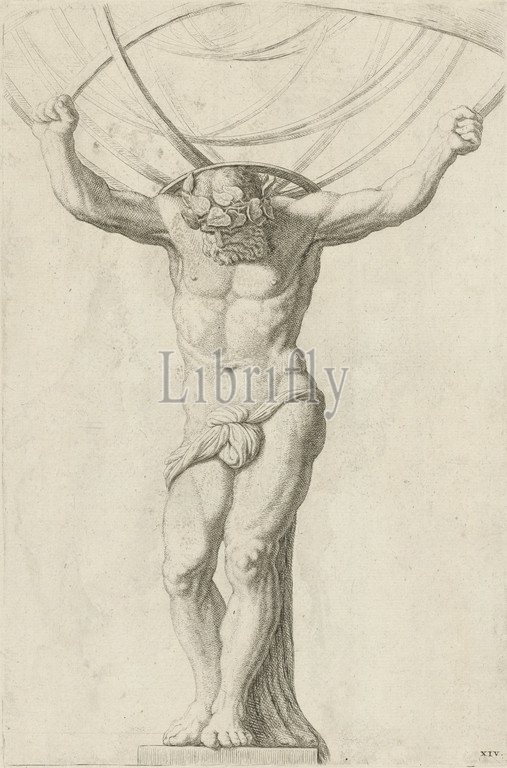 Statue of Atlas on the rear facade of the City Hall on the Dam, Hubert Quellinus, after Artus Quellinus (I), 1719 - 1783, Statue of Atlas, bearer of the celestial vault containing all stars, constellations and planets, in the center of the tympanum on the rear facade (west side) of the City Hall on the Dam in Amsterdam. Numbered bottom right: XIV., print maker: Hubert Quellinus, Hubert Quellinus, Artus Quellinus (I), Amsterdam, 1663 and/or 1719 - 1783, paper, etching, engraving, h 324 mm × w 214 mm