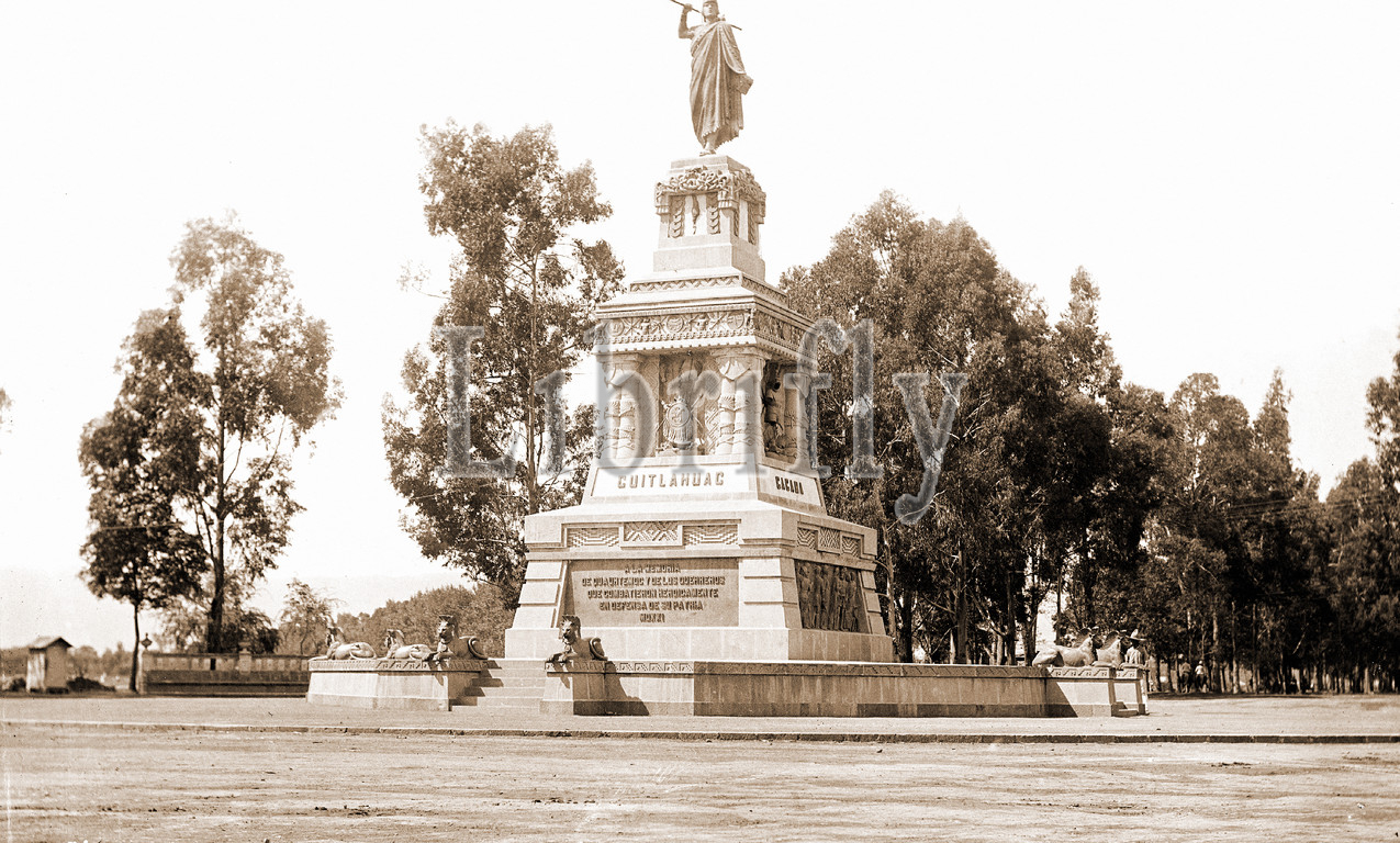 Statue of Cuitlahuac i.e. Cuauhtemoc, Jackson, William Henry, 1843-1942, Cuauhtemoc, Emperor of Mexico, 1495?-1525, Streets, Sculpture, Mexico, Mexico City, 1880
